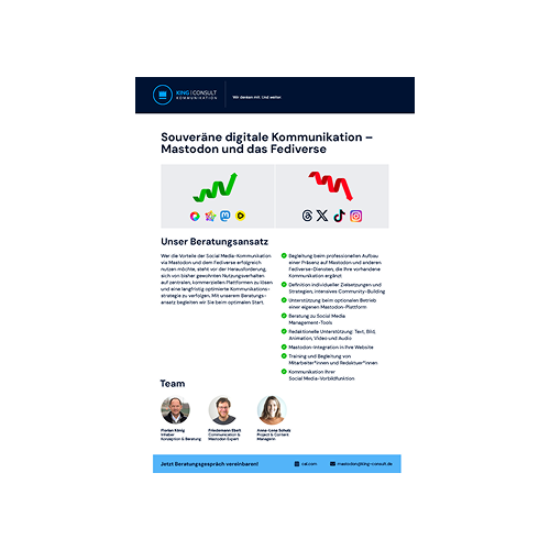Wer die Vorteile des Fediverse erfolgreich nutzen möchte, sollte sich vom bisherigen Nutzungsverhalten auf US-Plattformen lösen und eine langfristig optimierte Kommunikationsstrategie verfolgen. Gern unterstützen wir beim Aufbau und bei der strategischen Begleitung.